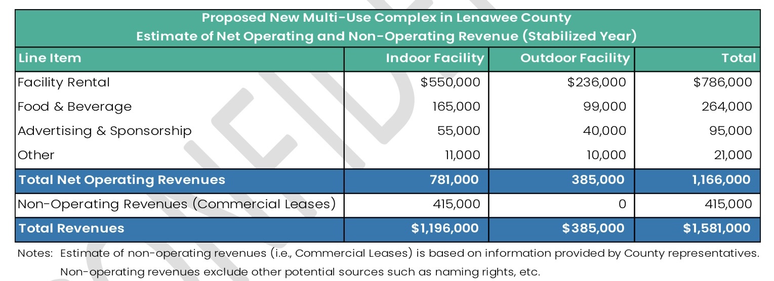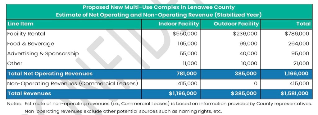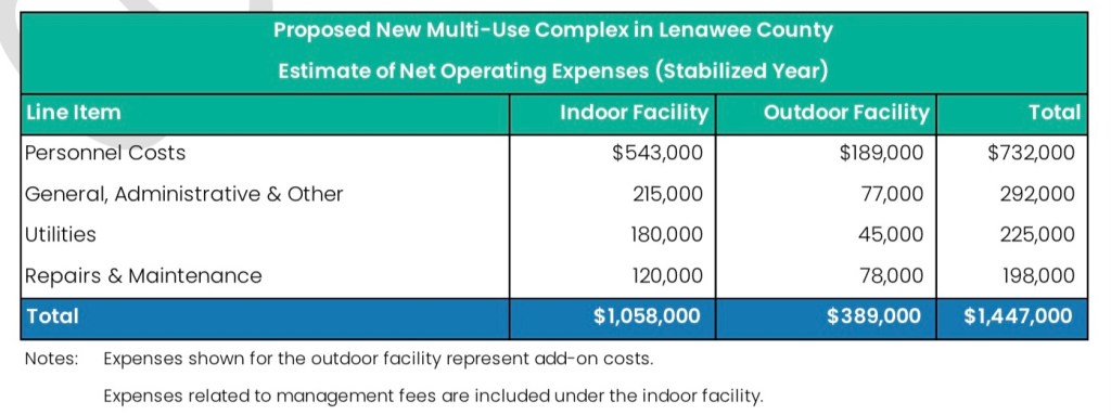 Lenawee County has been adamant that the new facility won’t require new taxes, but the draft analysis indicates that the completed facility—with both indoor and outdoor spaces—will operate at a deficit once it’s reached its maximum financial capability.