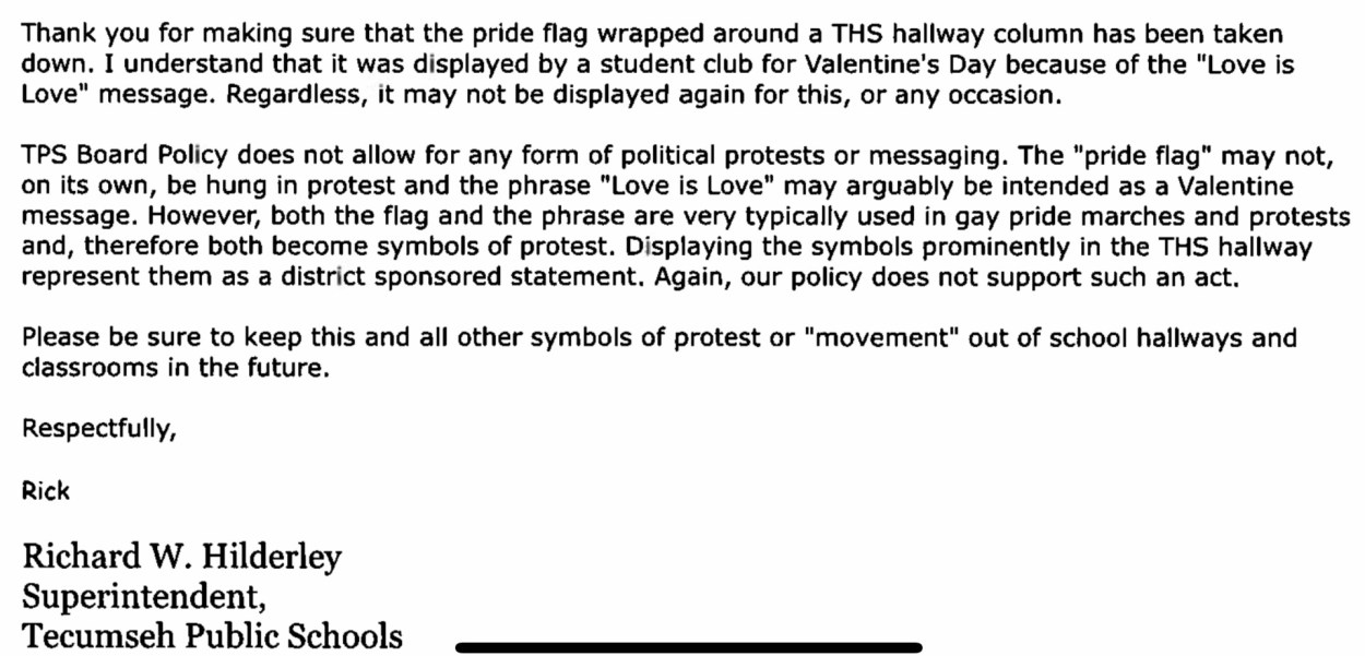 Today, we can add Tecumseh Public Schools’ name to that proud and prestigious mantle of hate.
